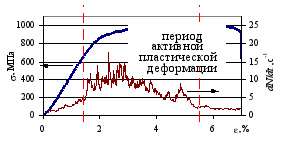 - текучести или легкого скольжения – с высокой степенью активности сигналов АЭ дислокационного типа, связанной с генерацией и движением дислокаций;