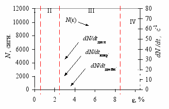 | Рис. 8 Графики зависимостей N=f(ε) и dN/dt=f(ε) для сигналов дислокационного типа, излучаемых микротрещинами и двойниками при деформации растяжением образца сплава ВТ20 |