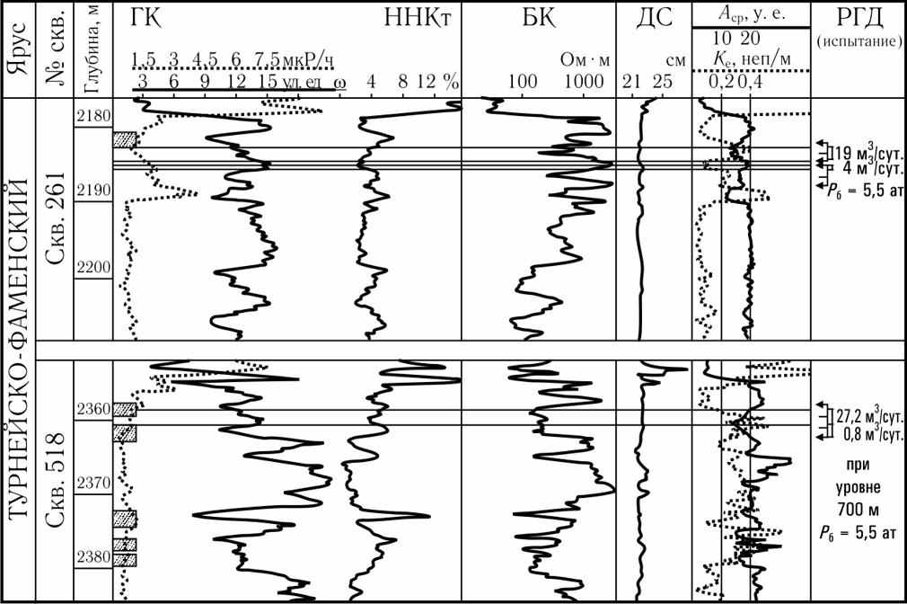 Практический пример выполнения исследований по этой технологии – выделение зон приточности в низкопористых турне-фаменских отложениях, вскрытых скважинами № 261 и № 518 Уньвинской площади (рис. 3.1).