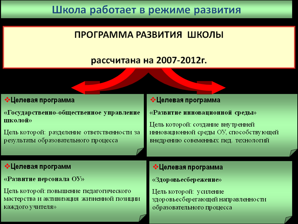 | Цели и задачи Программы | - Создание и развитие системы государственно-общественного управления школы; -Повышение педагогической компетентности; - Предоставление качественных образовательных услуг, отвечающих требованиям общества; - Создание благоприятной инновационной среды; - Сохранение и укрепление здоровья и обеспечения безопасности участников образовательного процесса; -Совершенствование материально-технического и информационного обеспечения образовательного процесса; |