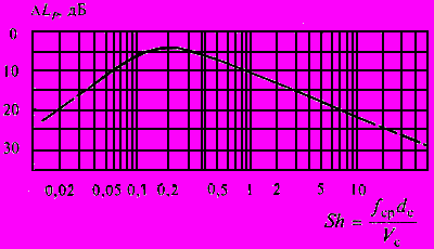 - разность общего и октавного уровней звуковой мощности шума, дБ, определяемая по графику относительного спектра звуковой мощности шума выхлопной струи турбореактивного двигателя, приведенному на рис.20, в зависимости от безразмерного параметра - числа Струхаля, который следует определять по формуле