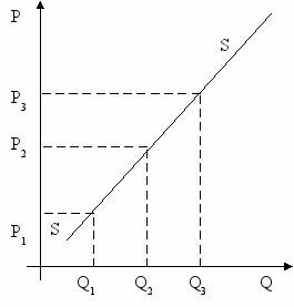 Так, цене Р соответствует объем предложения Q, а большей цене Р2, Р3 – больший объем предложения Q2, Q3. Соединив точки пересечения координат, получим линию предложения SS. В нормальном виде линия предложения направлена вверх и вправо, имеет положительный наклон.