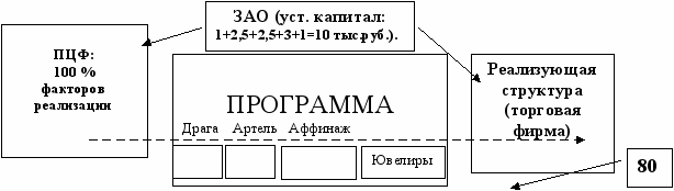 Частично этот вариант уже рассмотрен. Однако организационная часть, связанная с правовыми формами реализации проекта, осталась в стороне. Поэтому сразу укажем, что для 1-го варианта более всего подходит форма закрытого акционерного общества с тем дополнением, что оно должно на себя взять функцию управляющей компании, которая учредит некоммерческий проблемно-целевой фонд (ПЦФ) для реализации программы. Тогда выстроится следующая схема: