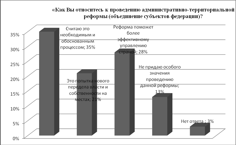 Опрос населения показал, что население Иркутской области и Усть-Ордынского Бурятского автономного округа проявляет интерес к процессу объединения двух субъектов. Это наглядно продемонстрировало распределение ответов на вопрос «Знаете ли Вы о проведении территориально-административной реформы (объединение субъектов федерации)?». Лишь 7% опрашиваемых ответили «Нет, не слышал(а) и вообще политикой не интересуюсь». Остальные ответы распределились между вариантами ответов «Да, конечно», «Да, что-то слышал/читал/видел», «Да, но не придаю этой реформе особого значения». Притом немаловажным нам представляется тот факт, что около 38% респондентов, проживающих в Иркутской области, продемонстрировали свое отношение к проводимой реформе, выбрав вариант ответа «Да, но не придаю этой реформе особого значения».