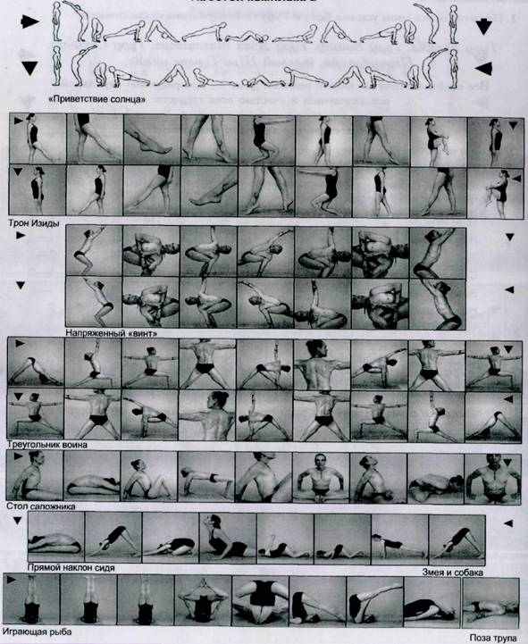 3. Выполняйте сурья-намаскар по крайней мере 5 минут (см. описание на стр. 155). Затем выполните последовательность асан, приведенную ниже. Периодически даются отдельные асаны, которые не входят в последовательность на фотографиях. Для них указано, на протяжении скольких дыханий следует находиться в этой позе. Когда ссылки на страницу отсутствуют, просто выполните эту асану (в данном примере это бхеки — «поза ребенка»). Числа в последней колонке означают степень сложности каждой асаны или последовательности.