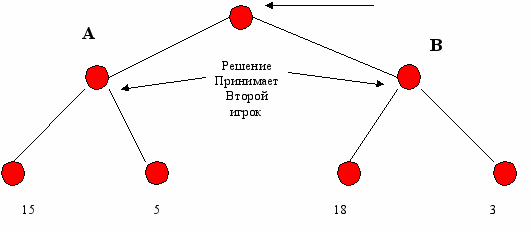 Первый игрок может принять решение выбрать ход А и он может принять решение выбрать ход В. Если он выберет ход А, то он может надеется получить в качестве выигрыша 15 очков. Если же он выберет ход В, то его надежда составит 18 очков. Это предварительное рассуждение говорит о том, что первый игрок, тот который ведёт анализ должен выбрать ход В. Однако необходимо посмотреть насколько оправданы его надежды.