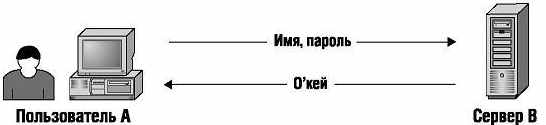 На рис. 2.1 пользователь А передает по сети на сервер свое имя и пароль. Некто, наблюдающий за средой передачи, например, пользователь С, может похитить пароль пользователя А. Как только это происходит, пользователь С может выдавать себя за пользователя А до тех пор, пока пароль не будет изменен, а это может продолжаться достаточно долгое время. Поэтому для безопасности вычислительной среды требуется регулярно менять пароли.
