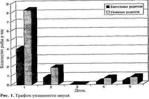 Окуни подразделялись на два класса. К первому классу принадлежали те, которые три или более раз ловились на искусственную наживку (и тем самым получали «титул» уязвимых); они представлены на графике серыми столбцами. Во второй класс входили те, которые не ловились вовсе (т.е. бдительные окуни); они изображены черными столбцами.