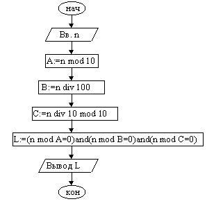 ![]() | 1. Ввести число n 2. A := n mod 10 {разряд единиц} 3. B := n div 100 {разряд сотен} 4. C := n div 10 mod 10 {десятки} 5. L := (n mod A=0) and (n mod B=0) and (n mod C=0) 6. Вывод L 7. Конец |