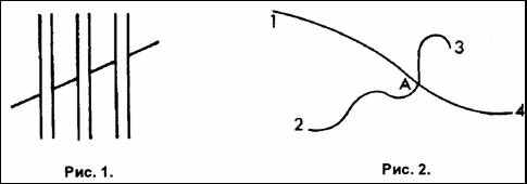 части, принадлежащие к разным предметам, с трудом воспринимаются как единое, а также помогает увидеть отдельно предметы, находящиеся в оптическом контакте. Две фигуры проиллюстрируют четвертый закон. На рис. 2 мы не сразу видим линии 1-А-2, З-А-4 или 2-А-4, зато хорошо видим 1-А-4 и 2-А-З. 5. Закон общего движения. Едиными воспринимаются элементы, движущиеся похожим образом и вместе, по отношению к другим, неподвижным.