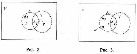 Теперь попробуем увеличить вероятность А (рис. 3) путем выведения из Ар ложного высказывания q. Получится, что если А ложно, это значит, что в АF содержится ложное высказывание f, поэтому f —> q есть истинное высказывание (ибо ложны и f и q). Мы видим, что, изымая ложное высказывание q из АF, мы соответственно выводим и истинное высказывание f —> q из AV, a это противоречит дефиниции 2.