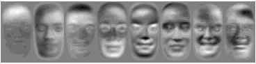 НС применяется так же для извлечения ключевых характеристик изображения, которые затем используются для последующей классификации. В [17,23], показан способ нейросетевой реализации метода анализа главных компонент. Суть метода анализа главных компонент заключается в получении максимально декореллированных коэффициентов, характеризующих входные образы. Эти коэффициенты называются главными компонентами и используются для статистического сжатия изображений, в котором небольшое число коэффициентов используется для представления всего образа. НС с одним скрытым слоем содержащим N нейронов (которое много меньше чем размерность изображения), обученная по методу обратного распространения ошибки восстанавливать на выходе изображение, поданное на вход, формирует на выходе скрытых нейронов коэффициенты первых N главных компонент, которые и используются для сравнения. Обычно используется от 10 до 200 главных компонент. С увеличением номера компоненты её репрезентативность сильно понижается, и использовать компоненты с большими номерами не имеет смысла. При использовании нелинейных активационных функций нейронных элементов возможна нелинейная декомпозиция на главные компоненты. Нелинейность позволяет более точно отразить вариации входных данных. Применяя анализ главных компонент к декомпозиции изображений лиц, получим главные компоненты, называемые собственными лицами [23], которым так же присуще полезное свойство – существуют компоненты, которые в основном отражают такие существенные характеристики лица как пол, раса, эмоции. При восстановлении компоненты имеют вид, похожий на лицо, причём первые отражают наиболее общую форму лица, последние – различные мелкие отличия между лицами (рис. 5). Такой метод хорошо применим для поиска похожих изображений лиц в больших базах данных. Показана так же возможность дальнейшего уменьшения размерности главных компонент при помощи НС [23]. Оценивая качество реконструкции входного изображения можно очень точно определять его принадлежность к классу лиц.