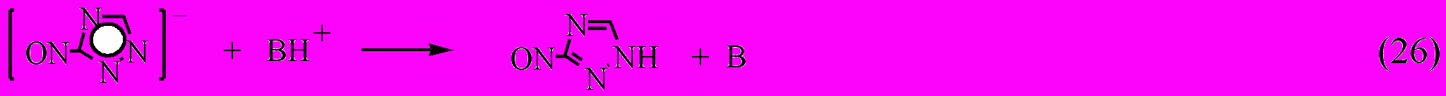 В механизме (23-26) катализатор лишь способствует переходу молекулы соединения VIII в реакционноспособную форму аниона нитротриазола, который затем без непосредственного участия катализатора, превращается в соответствующий радикал, приводящий к раскрытию триазольного кольца и окислительно-восстановительным реакциям. Этот механизм реализуется также при термораспаде соединений XI и XII.