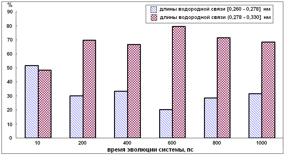 Как видно из рисунка, при времени эволюции системы, большем, чем 200 пс, значительная часть водородных мостиков во фрагменте катионообменника имеет длину, большую, чем в воде с ненарушенной структурой, что свидетельствует об ослаблении Н-связей в исследованном фрагменте по сравнению с таковыми в жидкой воде. Ослабление водородных связей между молекулами воды обусловлено разрушением сетки водородных связей ионообменниками, фиксированные группы которых обладают отрицательным типом гидратации. Причем расчет показал, что даже в случае положительного типа гидратации катиона в исследованной системе, совместное воздействие катиона и аниона на структуру воды является разрушающим. Таким образом, разрушающее действие отрицательно гидратированного аниона преобладает над ориентирующим действием положительно гидратированного катиона.