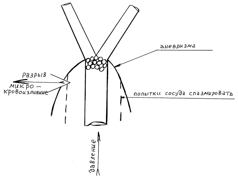 После табачной затяжки через некоторое время по всем сосудам идёт спазм. В том числе и в месте аневризмы сосуд пытается спазмировать. А стеночка сосуда натянута, изношена. А давление снизу нешуточное подпирает. И при какой-то очередной затяжке стенка сосуда не выдерживает, прорывается и происходит микрокровоизлияние.