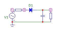 В качестве иллюстрации посмотрим как появляются гармоники в обычной схеме выпрямления напряжения через такой нелинейный элемент как полупроводниковый диод, у которого меняется значение сопротивления в зависимости от направления протекающего тока.