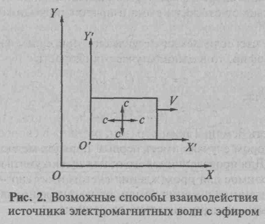 Допустим, система X'Y'O' (рис. 2) с источником света (скорость света с) движется со скоростью V по отношению к неподвижной системе XYO (в условиях, когда эфир полностью увлекается движущейся системой). Тогда в соответствии с принципом относительности:
