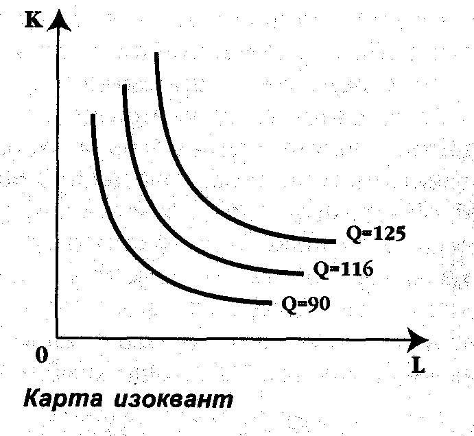 изокванты имеют выпуклую по отношению к началу координат форму. Это связано с тем, что по мере увеличения количества фактора L его предельный продукт уменьшается относительного предельного продукта фактора К. Соответственно, сокращение применяемого фактора К ведет к росту его предельного продукта, что знаменатель будет расти, а числитель будет уменьшаться, MRTSKL будет снижаться.