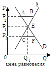 Главный фактор, воздействующий на предложение, - издержки производства, если удается снизить издержки производства, кривая предложения S1 смещается вправо. К сдвигу кривой предложения приводят также и изменения в налогообложении; повышение налогов, которые уплачивает производитель, приводит к сдвигу кривой предложения влево, а снижение налогов – к сдвигу кривой вправо.Если наложить друг на друга два графика, обозначающие рыночный спрос и рыночное предложение одного и того же товара, получим график, показывающий одновременное поведение спроса и предложения интересующего нас товара. В какой-то точке две кривые пересекутся. В точке встречи Е спрос количественно равен предложению (Q1) и цена Р1 выступает как уравновешивающая цена, или цена равновесия.