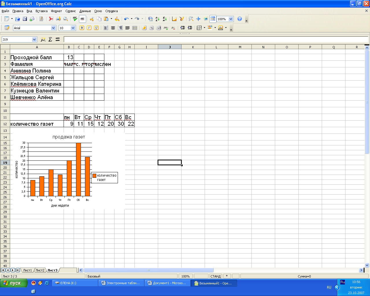 При запуске Calc открывается файл, состоящий из трех листов – Лист1, Лист2 и Лист3. Щелкая левой клавишей по ярлычку листа, можно переходить из одного листа в другой. Можно дать им и более осмысленное название. Для этого необходимо щелкнуть по ярлычку листа правой клавишей мыши, вызвав контекстно-зависимое меню, выбрать опцию Переименовать и набрать с клавиатуры новое имя, например, «Журнал успеваемости».