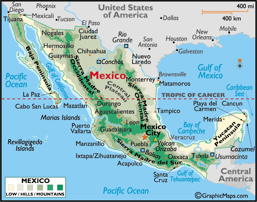 ельеф местности. Большую часть Мексики занимает Мексиканское нагорье, переходящее на севере в высокие равнины и плато Техаса и Нью-Мексико; с востока, запада и юга оно окружено глубоко расчлененными горными хребтами. Центральная часть этого нагорья состоит из обширных впадин – больсонов – с пологими склонами; разделяющие их блоковые хребты часто увенчаны вулканами Большая часть этого пустынного района бессточная; только на севере протекает крупнейшая река Мексики Рио-Браво-дель-Норте.Далее к югу поверхность нагорья повышается; многочисленные межгорные впадины расположены здесь на отметках 1800–2400 м над у