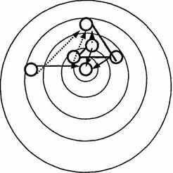 Человека, у которого наибольший статус, называют «звездой». Если человек получает среднее количество выборов и минимальное — отвержений, его относят к категории «предпочитаемых». Если у него меньше среднего количество выборов и отвержений, — то к категории «пренебрегаемых». Если человек получил только отвержения, то его относят к «отвергаемым». Последняя, самая неблагополучная категория членов группы — «изолированные», которые вообще не получили ни выборов, ни отвержений. Положение изолированного в группе наиболее неблагоприятно. Статусная социограмма изображена на рис. 2. По мере удаления от центра статус члена группы понижается в соответствии с описанным ранее делением: звезда или звезды, предпочитаемые, пренебрегаемые, отверженные и изолированные.