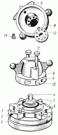 1 — штифт стальной; 2 — втулка стальная; 3 —диск гетинаксовый; 4 — вырез в диске 3; 5 — вал коленчатый; 6 — стержень контактный; 7 — кольца контактные; 8 — втулка бумажно-бакелитовая; 9 — кабель