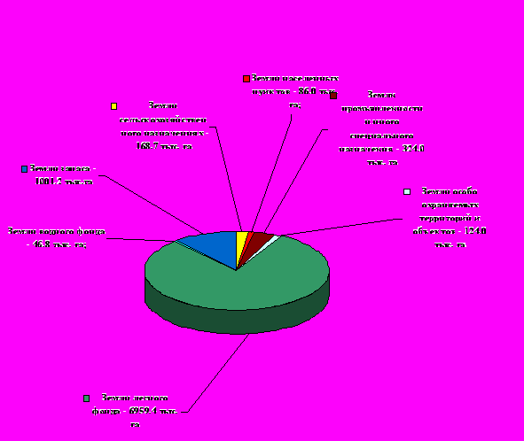Общая площадь земельного фонда области составляет 8 710,1 тыс. га. Из общей площади земли сельскохозяйственного назначения составляют 168,7 тыс. га (1,94 %), земли поселений – 86,0 тыс. га (0,99 %), земли промышленности и транспорта – 324,0 тыс. га (3,72 %), земли особо охраняемых территорий – 124,0 тыс. га (1,42 %), земли лесного фонда – 6 959,4 тыс. га (79,9 %), земли запаса – 1 001,2 тыс. га (11,5 %) и земли водного фонда – 46,8 тыс. га (0,54 %) (см. диаграмму «Земельный фонд Сахалинской области»).