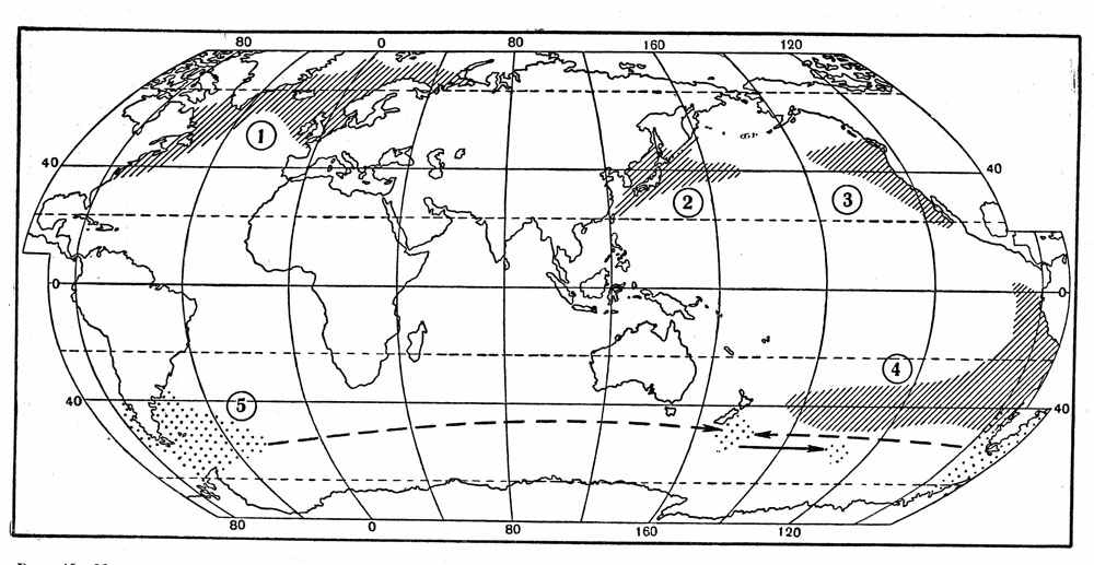 Рис, 15. Максимально расширенные ареалы псевдонеритических рыб — атлантической сельди (1), сардины иваси и дальневосточной скумбрии (2), калифорнийской (3) и перуано-чилийской ставриды (4) и возможные пути расселения южной путассу (3).В двух последних случаях вид может рассматриваться как временно или постоянно обосновавшийся в том или ином конкретном участке открытого океана. Примеры, иллюстрирующие сказанное, ограничиваются, к сожалению, данными за самые последние десятилетия, так как имеющиеся ряды наблюдений очень коротки. Большая часть этих примеров относится к Северной Пацифике.
