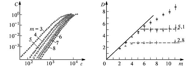 Эта зависимость называется интегральной корреляционной функцией аттрактора. Очевидно, что C(ε) растет с увеличением ε. При этом, если восстановленный аттрактор одномерен, то C(ε) ~ ε, если он представляет собой поверхность, то C(ε) ~ ε2; в общем же случае можно записать в виде C(ε) ~εD, где D- размерность восстановленного аттрактора.