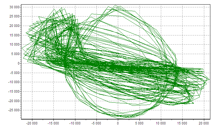 Рисунок 11. Численное моделирование системы Ресслера при значительной длине временного ряда N=100000.