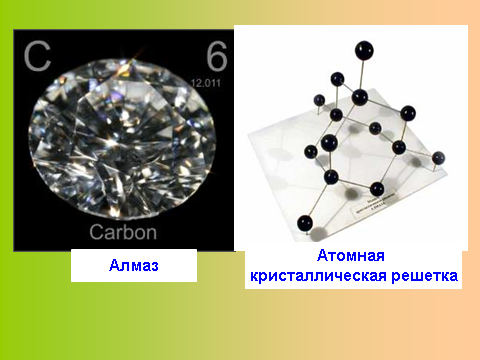 Атомными называют кристаллические решетками, в узлах которых находятся отдельные атомы, которые соединены между собой очень прочными ковалентными связями , например у алмаза.