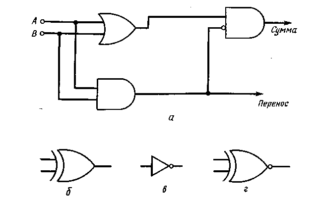 Рис. 8.8. Полусумматор (а) и условные обозначения схем ИСКЛЮЧАЮЩЕЕ ИЛИ (б), НЕ (в) и ИСКЛЮЧАЮЩЕЕ ИЛИ-НЕ (г).