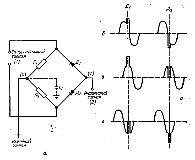 Предположим, что при равенстве фаз двух сигналов выходной сигнал равен нулю, тогда временные диаграммы напряжений на диодах Д1 и Д2 должны иметь вид, показанный на рис. 9.8, б — г. Положительная полярность синхроимпульсов, поступающих на вход 2 (на узел с диодами Д1 и Д2), обусловливает проводимость обоих диодов. Импульсный ток обоих диодов поступает в узел с резисторами R1 и R2 и замыкается на землю через конденсатор С1 (штриховая линия на рисунке). Если проводимость обоих диодов одинакова и мостик уравновешен, то на зажимах X и У нет напряжения, поскольку эти зажимы идентичны тем узлам стандартной мостовой схемы, между которыми включается прибор для индикации равновесия.