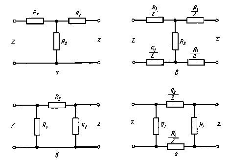 Рис. 5.12. Симметричные Т-, Н-, П- и 0-образные аттенюаторы.