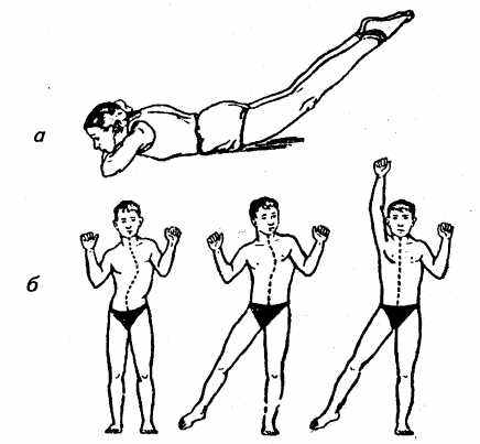 Для детей со сколиозом II—III степени исходное положение коррекции подбирается строго индивидуально в зависимости от типа сколиоза. Например, при грудном типе сколиоза с вершиной на 8—9-м грудном позвонке для снижении компрессии с вогнутой стороны дуги применяют асимметричные исходные положения для плечевого пояса: рука с вогнутой стороны сколиоза выносится при плавании вперед. При поясничном типе (вершина дуги на 2—3-м поясничном позвонках), груди? но-поясничном типе (вершина дуги на 12-м грудном или 1-м поясничном позвонках) сколиоза для коррекции дуги могут быть использованы асимметричные исходные положения для тазового пояса: при плавании нога с выпуклой стороны поясничной дуги отводится с фиксацией таза на доске. При комбинированном типе сколиоза с двумя первичными дугами (грудной и поясничный) особое внимание уделяется коррекции грудной дуги.