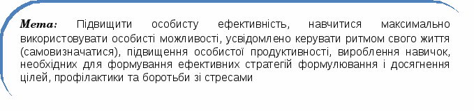 - Управління часом: постановка цілей, алгоритм і методи цілепокладання; інструменти планування; інструментарій з ефективного прийняття рішень; упорядкування розпорядку дня; організація трудового процесу; алгоритм планування дня; відпочинок і самомотивація; контроль і самоконтроль.