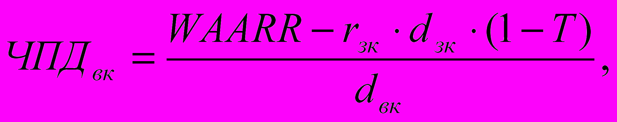 (3)де rзк – середньозважена вартість залученого капіталу банку; dвк, dзк, відповідно, питома вага власного та залученого капіталу банку; WAARR (weighted average asset return rate) – середньозважена доходність активів банку.