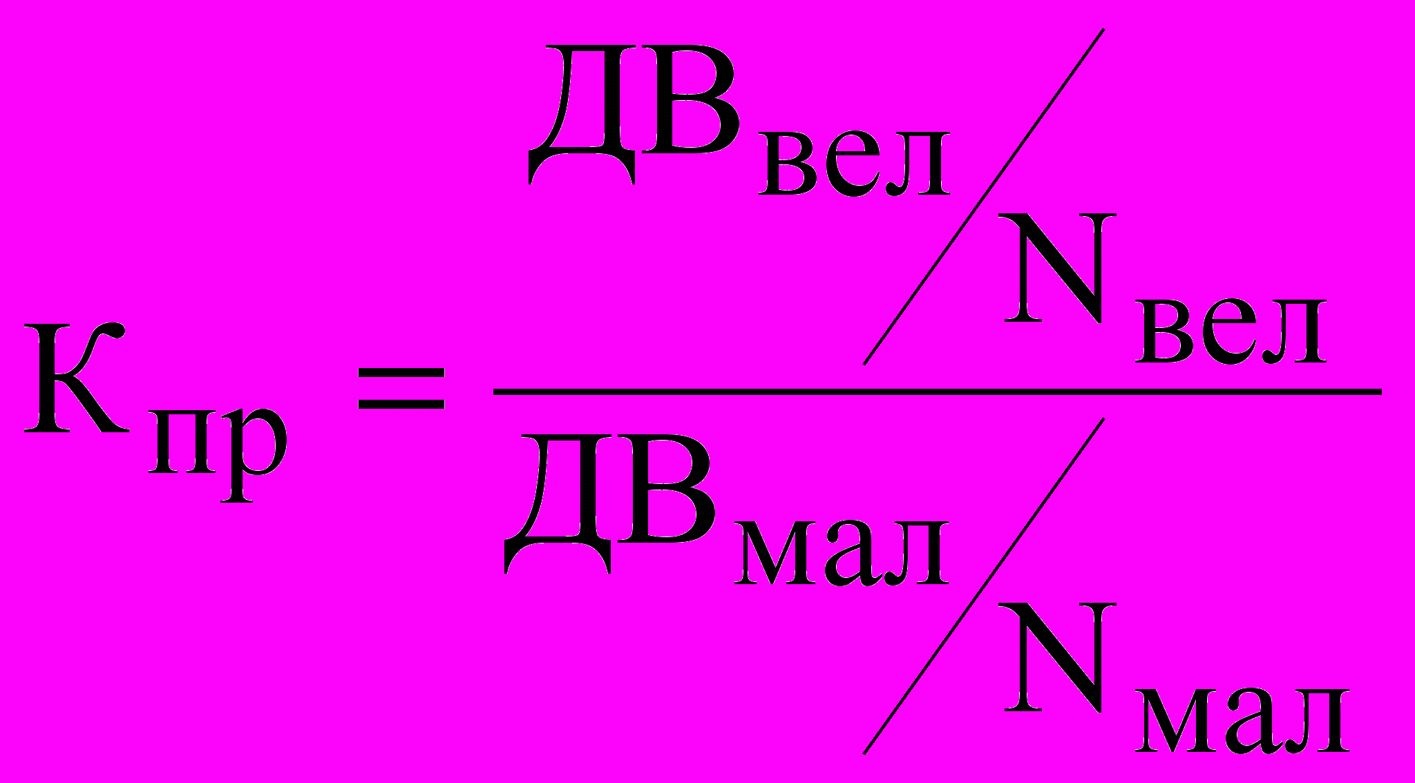 - кількість зайнятих на великих, малих підприємствах відповідно.Відповідно до непрямого методу аналізу коефіцієнт перевищення продуктивності праці одного зайнятого на великих підприємствах, порівняно з малими такий: