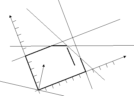 3) ЗЛП зводиться до розв'язку задачі, у якому кожній лінійній нерівності відповідає якась півплощина. Перетинання цих півплощин є опуклий багатокутник. Область припустимих розв'язків визначимо, побудувавши граничні прямі: