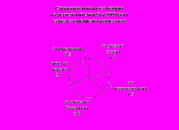 Плинність кадрів на державній службі станом на 01 січня 2010 року становила 8,6 %, що на 5,4% менше, ніж станом на 01 січня 2008 року.