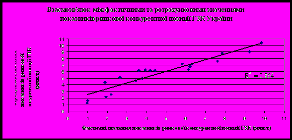 Рис.3.2. Взаємозв’язок між фактичними та розрахунковими значеннями показників ринкової позиції ГЗК України (за даними 2004-2007 рр.).