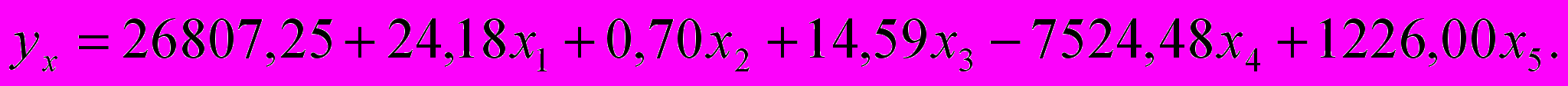 Одночасно із групуванням вибірки найбільш типових сільськогосподарських підприємств було проведено кореляційно-регресійний аналіз факторів що формують рівень продуктивності праці. Попередній аналіз сукупності із 17 факторів методом парної прямолінійної кореляції та перевірка отриманих коефіцієнтів на наявність мультиколінеарності дозволили сформувати кінцеву багатофакторну модель, до якої увійшли такі найбільш вагомі фактори: х1 – витрати на основне виробництво з розрахунку на 1 га сільськогосподарських угідь, грн; х2 – оплата праці одного середньорічного працівника за рік, грн; х3 – витрати на мінеральні добрива з розрахунку на 1 га посівної площі, грн; х4 – кількість працівників, що припадає на 100 га сільськогосподарських угідь, осіб; х5 – навантаження тварин на одного працівника у тваринництві, умовних голів. Обчислене за результатами діяльності у 2005 р. вибірки досліджуваних підприємств Харківської області рівняння регресії, що відображає лінійну залежність виробництва валової продукції з розрахунку на одного працівника від вищенаведених факторів, має таке вираження: