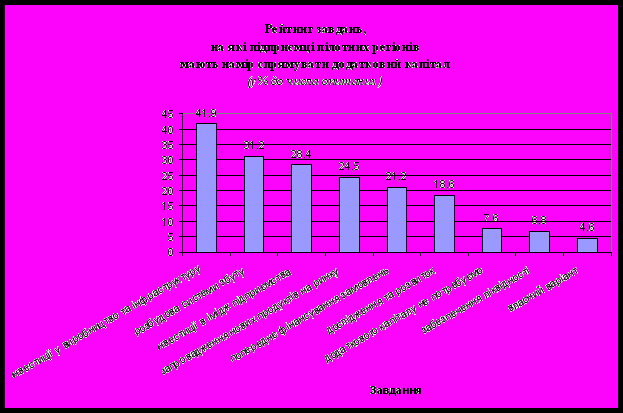 У рейтингу завдань, на які підприємці усіх пілотних регіонів насамперед мають намір спрямувати додатковий капітал, перше місце посідають інвестиції у виробництво та інфраструктуру. На значущість цього завдання істотною мірою впливає розмір підприємства. Інвестували б додаткові кошти передусім у виробництво та інфрастуктуру понад 70% респондентів, що презентували малі підприємства з чисельністю працівників до 50 осіб на рік. Аналогічним чином використали б додаткові кошти 60,8% середніх підприємств, 45,9% МП з чисельністю працівників до 25 осіб і 36,7% МП з чисельністю до 10 осіб на рік. Підприємці-фізичні особи потребують додаткових коштів насамперед для запровадження нових продуктів та розбудови системи збуту. На пріоритетність кожного із зазначених завдань вказали по 27,6% опитаних цієї категорії.