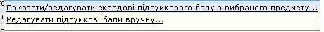 . Натискаємо на гіперпосилання "Закінчити та перейти до реєстрації оцінок/балів.". У вікні "ПС-Студент. Оцінки диплому..." після цього з`являються відповідні колонки.2. Наводимо курсор на колонку з потрібною дисципліною та натискаємо ліву або праву кнопку миші та у меню, що з`явилось, обираємо дію