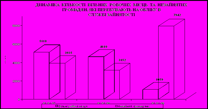 Наявність вільних робочих місць на 01.01.2009 склала 1059 од., що в 4,4 рази менше, ніж на 01.01.2008 (4610 од.). Навантаження на одне вільне робоче місце - майже 8 чол.