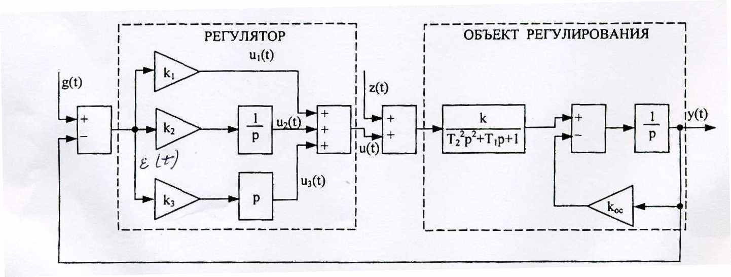 На цій схемі: g(t) – вплив, що задає; z(t) - вплив, що обурює, наведений до входу об'єкта; (t) - неузгодженість; y(t) - вихідна (регульована) змінна; u(t) = u1(t) + u2(t) + u3(t) - керуючий вплив.