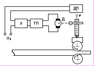 1 - прокатна кліть; 2 - барабан; ТГ1, ТГ2 - тахогенератори;