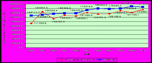 Показатель общей заболеваемости взрослого населения в 2010 г. в Городищенском районе составил 89396,3 на 100 тыс. взрослого населения, что ниже областного значения на 36,8%. По значению данного показателя район находится на 21 ранговом месте (в 2009 г. – 22 место). За период 2009-2010 гг. отмечается незначительное снижение уровня общей заболеваемости возрастного контингента старше 18 лет (-3,4%). За период 2000-2010 гг. значения данного показателя в районе стабильно ниже среднеобластных (рис. 9).