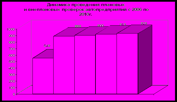 Проведено 929 плановых и внеплановых проверок автопредприятий. Количество плановых проверок предприятий за последние пять лет возросло с 549 в 2006 году до 929 в 2010 году.